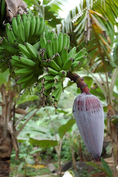 Wat zou het leven in de tropen voorstellen zonder bananen? Je kunt er van alles mee doen. Dakbedekking maken, van de bladvezels touw maken. De bladeren als bord gebruiken. Of om vlees boven een vuur te roosteren. En tenslotte zijn de bessen eetbaar en smakelijk. Bessen? Ik zie u al denken. Maar het is toch echt waar. Biologisch gezien zijn de vruchten van bananen bessen! Aan een bananenboom groeien bessen? Ja zeker, maar een banaan is dan ook geen boom. Het zijn kruidachtige gewassen, net zoals een kropje sla een kruidachtig gewas is. De stam van een banaan bestaat uit in elkaar gedraaide bladstelen. Zodra een banaan rijpe vruchten heeft gedragen gaat dit deel van de plant dood, het groeit niet als een boom door. Dat doodgaan is niet erg, want als de bananen beginnen te groeien vormt het wortelstel nieuwe uitlopers voor de volgende oogst. Maar meestal worden de bananen, zeker voor de export, geoogst voor de plant dood is. Ze zijn nog groen en worden groen over de wereld verscheept om in rijpingshuizen na te rijpen, onder invloed van acyteleengas. Rijp worden ze wel, maar niet zoet en sappig.