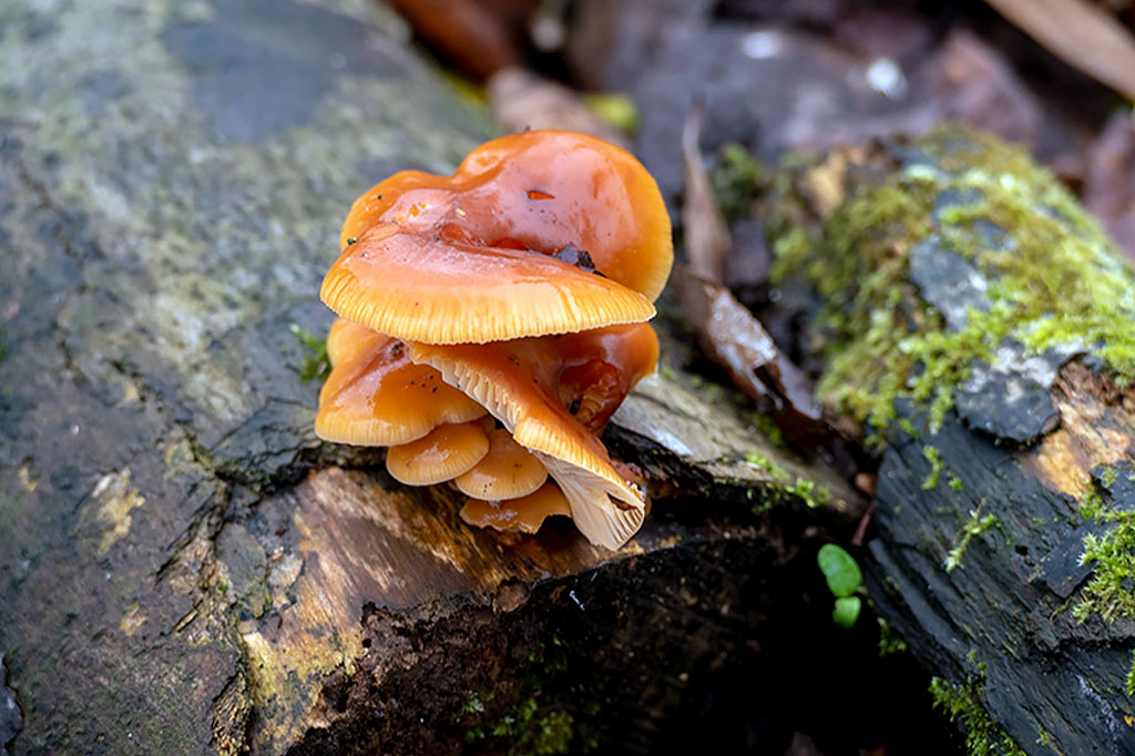 De winterpaddenstoel bij uitstek is het fluweelpootje, Flammulina velutipes. Onmiskenbaar, door zijn donkeroranje hoed en een zwarte fluweelachtige steel. Hij groeit op allerlei soorten hout en is zeer algemeen in het hele land. Hij is goed eetbaar en smakelijk en wordt in met name Japan veel gekweekt. Daar gebruikt men broed voor dat op een geschikte voedingsbodem in oude cola-flesjes geënt wordt. Dat mondt uit in lange witte steeltjes met een rond kopje. Ze zijn in de handel als Enoki-take. Take betekent paddenstoel, Enoki weet ik niet, maar is de naam van een boom. Ze worden in het donker geteeld, waardoor de vruchtlichamen wit blijven. Ik gebruik ze graag in een heldere bouillon. En de wilde heb ik ook gegeten, gevuld met ragout. Beide overheerlijk! Ooit vond ik midden in de zomer fluweelpootjes. Die worden nu als aparte soort onderscheiden: het zomerfluweelpootje, Flammulina fennae. Benoemd door de beroemde Leidse paddenstoelenonderzoeker Kees Bas, naar zijn echtgenote Fenna.