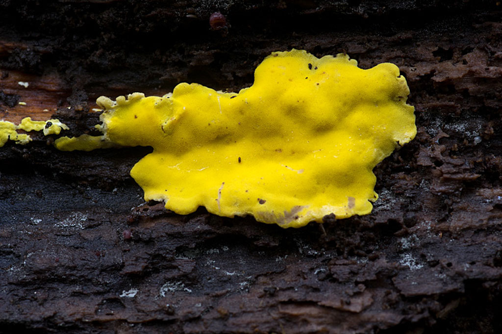 Een van de meest vreemde winterwaarnemingen van paddenstoelen is die van het zwavelgeel elfenbankje, Flaviporus brownii. Die was bekend van de tropische tuin in Burgers Bush. Theo Westra vond deze soort eind november 2015 op het eiland Koudenhoorn aan de onderzijde van een populierenstam. Het was ijskoud en kletsnat weer, hetgeen ook te zien is op de foto’s. Zoals de naam al aangeeft is deze paddenstoel knalgeel. De vondst op Koudenhoorn is de enige naast die van Burgers Bush. Op de Verspreidingsatlas staan bij Koudenhoorn twee stippen. Hij groeit precies op de grens van twee atlasblokken. Theo heeft hem van het ene atlasblok gemeld, ik van de tweede. Van heinde en verre kwamen mensen naar Koudenhoorn om hem te zien. Dat heeft de horeca op het eiland overigens geen windeieren gelegd. Dus voor mensen die verbaasd zijn over winterse paddenstoelen, zelfs in dit jaargetijde kan je nieuwe vondsten doen. Wat mij altijd bevreemd heeft is dat de Mycologische Vereniging deze vondst van mij omarmd heeft, en ook die uit Burgers Bush, maar een vondst van een andere nieuwe soort voor ons land van mij, in de tropische kas van de Hortus, Geastrum welwitschii (geen Nederlandse naam, een aardster) heeft afgewezen omdat het een exoot zou zijn. Dit is meten met twee maten!