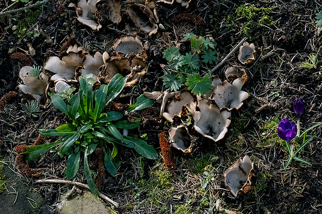 Ik kan nog uren doorgaan met winterwaarnemingen, maar dan ga ik u ongetwijfeld vervelen. Dus afronden. Twee bekerzwammen uit de winter moeten nog de revue passeren. Een bekerzwam die steeds algemener wordt is de cedergrondbekerzwam Geopora sumnerianaI Dit is een begeleider van alle soorten ceder. Die is wel degelijk algemeen geworden door de klimaatverandering. Toen ik die in 1996 in de Leidse Hortus ontdekte, was dat de vierde vondst in Nederland. Nu heb alleen al bij mij in de buurt meer dan 10 vindplaatsen. Ieder jaar maakte ik daar foto’s van op de Cronesteijnkade. Op een gegeven moment kwam de bewoonster uit het huis en die vroeg me waar ik tussen haar fietsen foto’s van maakte (ik vind het bij stadnatuur altijd leuk om op de foto auto’s, fietsen of vuilnis te hebben). Ik liet de paddenstoelen zien. Ze was stomverbaasd. Oh, zei ze, die schoffel ik altijd weg, ik dacht het kwaad kon voor de planten. Nadat ik had uitgelegd wat het was en wat het belang van de paddenstoelen is, laat ze de vruchtlichamen met rust. Meestal is er in deze tijd al een vondst gepubliceerd op Waarneming.nl, maar dit jaar merkwaardig genoeg nog niet, ondanks de warme periode.