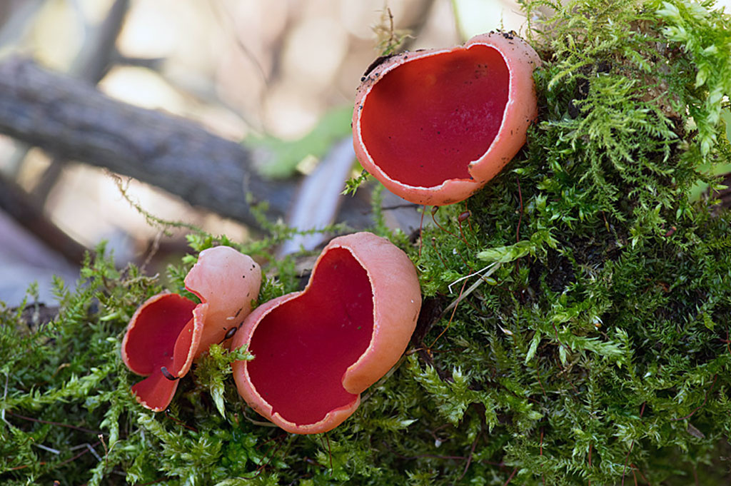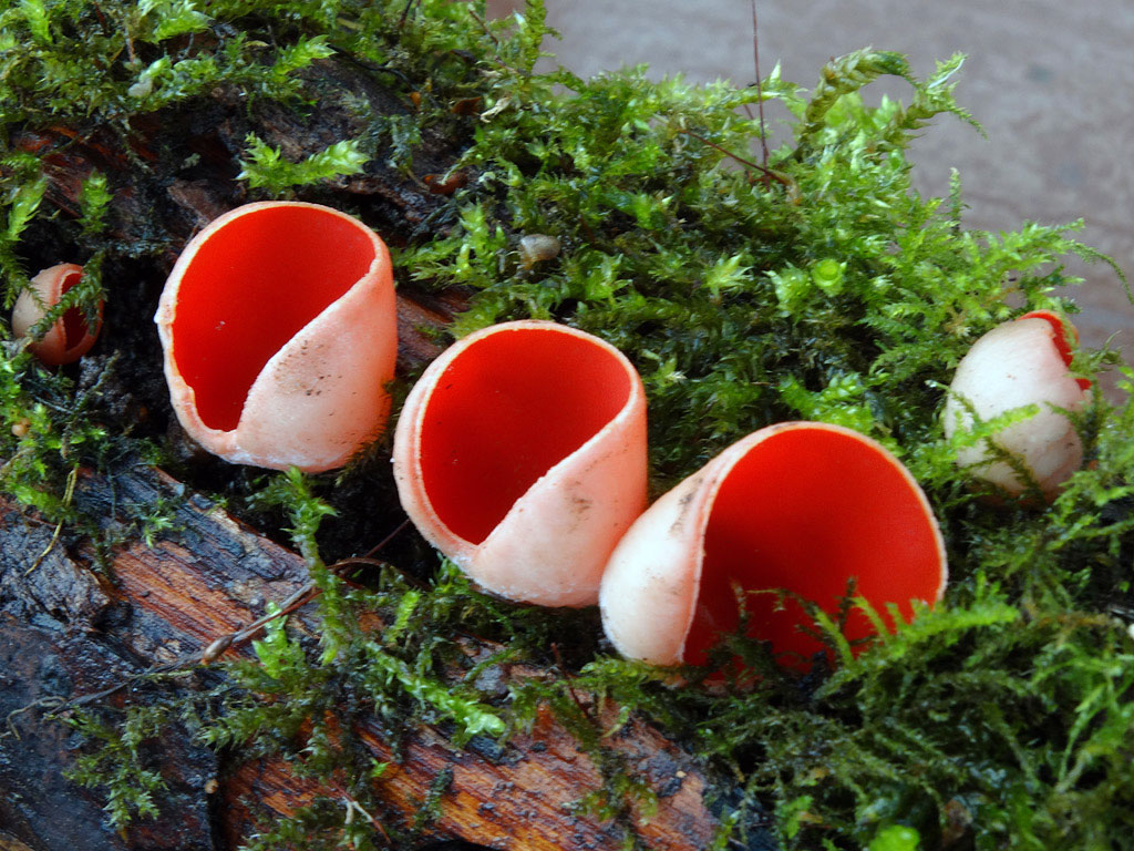 Ik besluit met de wonderschone kelkzwammen, Sarcoscypha austriaca en S. ruber. Beide zijn scharlakenrode bekers die op half ondergegraven bemoste takken van populier en vooral wilg groeien in kletsnatte polderbossen, zoals Koudenhoorn in de Kagerplassen. Om ze goed te onderscheiden is een microscoop nodig, maar met een beetje oefening kan je ze wel zo herkennen. Ze komen pas een jaar of 50 in Nederland voor, maar nemen explosief toe. Aangezien het van oorsprong een montane soort is, hebben we nu eens niet te maken met klimaatverandering! Je kan ze ook regelmatig in de sneeuw vinden, daar trekken ze zich niks van aan.