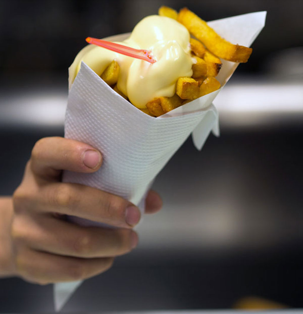 Frites en patat horen inmiddels tot het cultureel erfgoed, en niet alleen in Vlaanderen en Nederland. En dan zoals ik zoals ik al eerder zei, in een puntzakje, een klodder mayo en een houten vorkje. Later kwam het plastic bakje met pindasaus, uitjes, piccalilly, Alles tegelijk erop (‘Patatje oorlog’), weer later met kerriesaus, aardappel van geperst aardappelmeel (Raspatat,  er zijn mensen die zweren erbij, ik vind het vreselijk. Ik geloof dat de laatste innovatie de Joppiesaus was. Die ik overigens wel lekker vind. Weer later kwam er de ‘kapsalon’, genoemd naar een Rotterdamse kapper. Als die bestelde riep de man bij de telefoon naar de bakploeg: ‘eenmaal kapsaloon!’