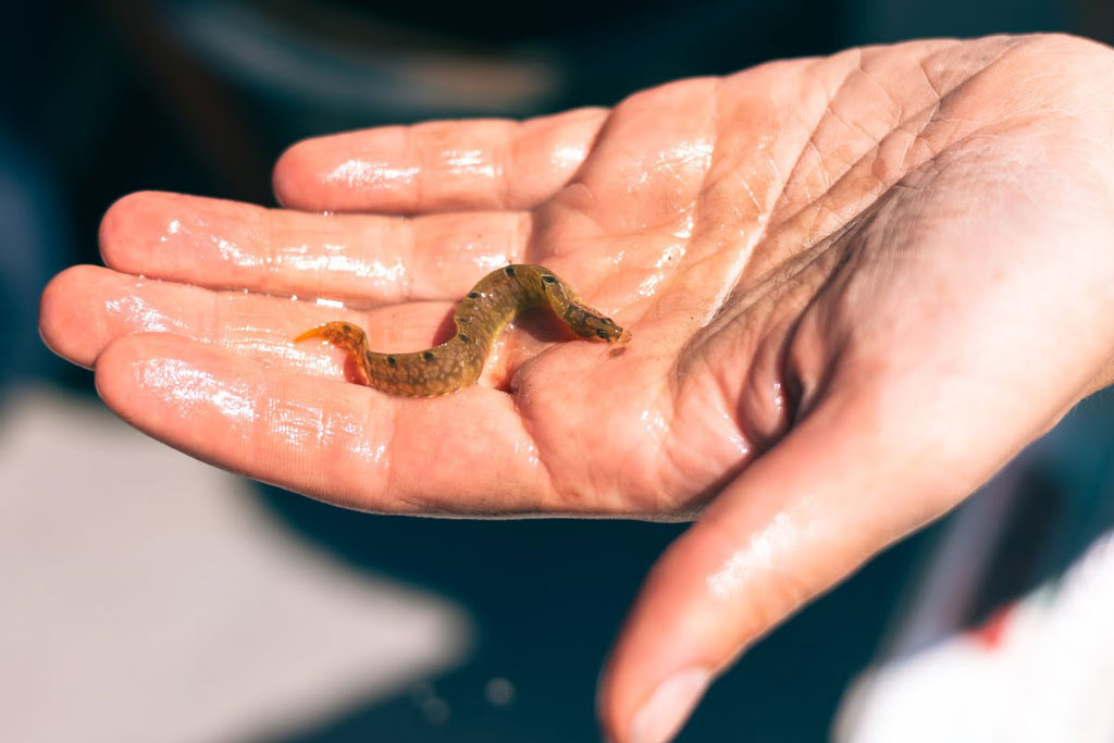 Jonge botervis Pholis gunnellus uit boomrif. Foto Erik Hoekendijk.