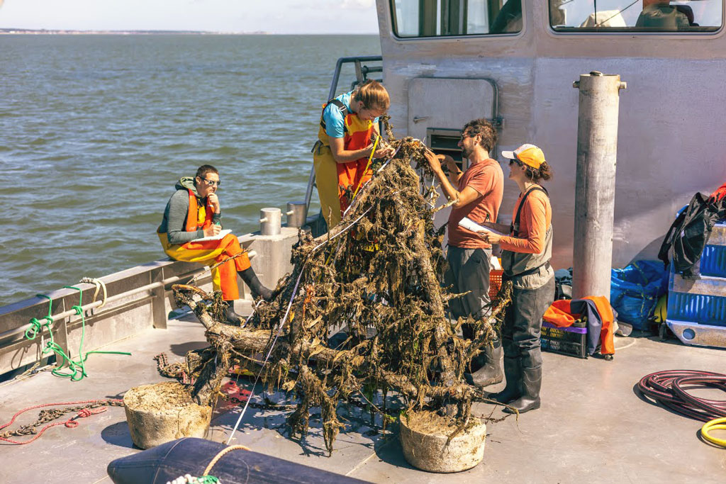 Met blokken beton aan de voet, verdwenen 192 bomen, omgebouwd tot 32 ‘kunstriffen’, in 2022 in de Waddenzee. Met behulp van camera’s op de betonnen voeten, met fuiken, en ook door enkele van die riffen op gezette tijden even naar boven te halen, controleren Dickson en collega’s hoeveel leven ze aantrekken. “En dat is gigantisch”, zegt hij onomwonden.