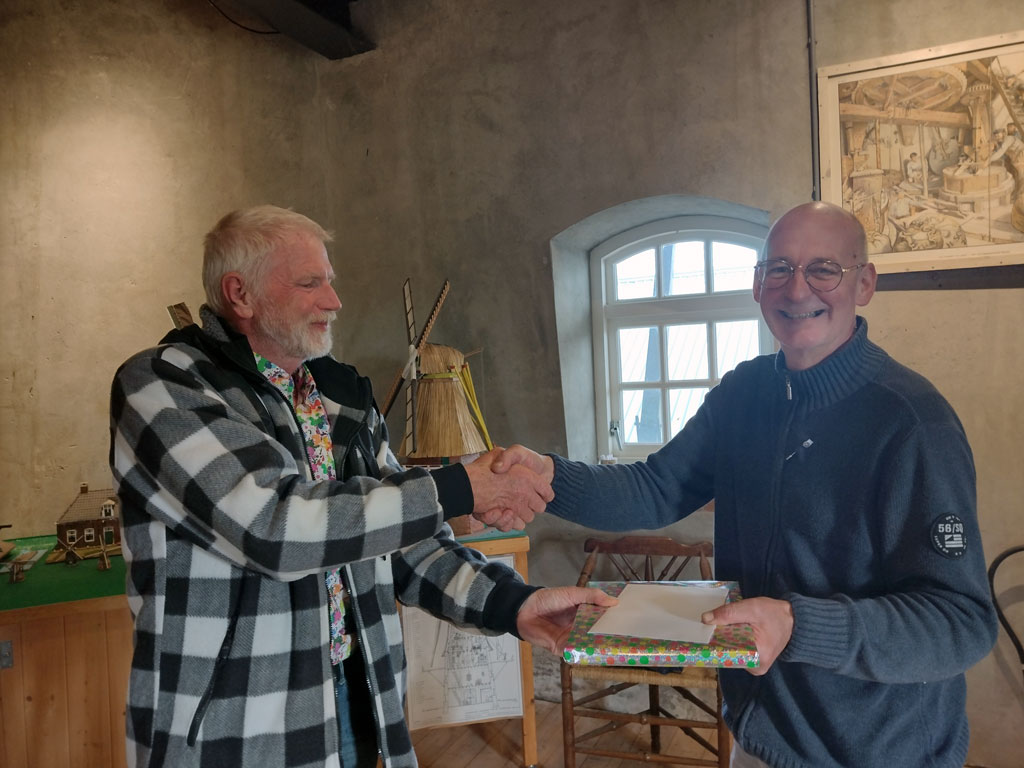 Voorzitter van de examencommissie Nico van den Broek feliciteert Dik Loman met het slagen voor het examen tot windmolenaar.
