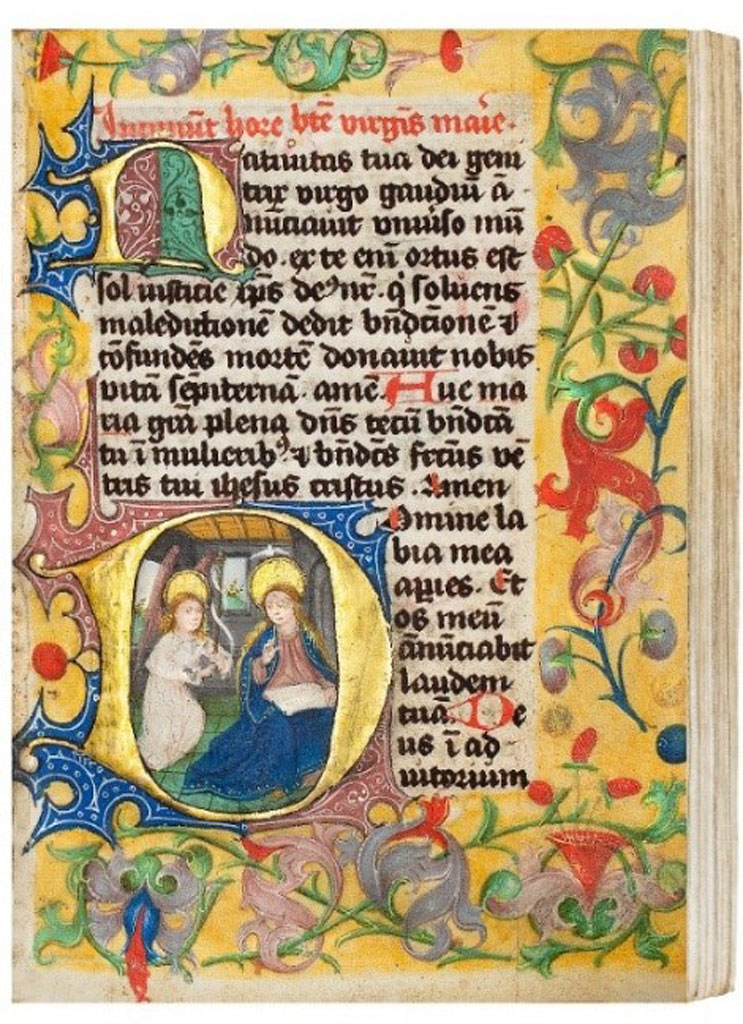 Gedecoreerde hoofdletter met de Aankondiging van de geboorte van Christus, met rijke randversieringen, Cisterciënzer gebedenboek, Nederrijn omstreeks 1500. Courtesy of Dr. Jörn Günther Rare Books, Bazel.