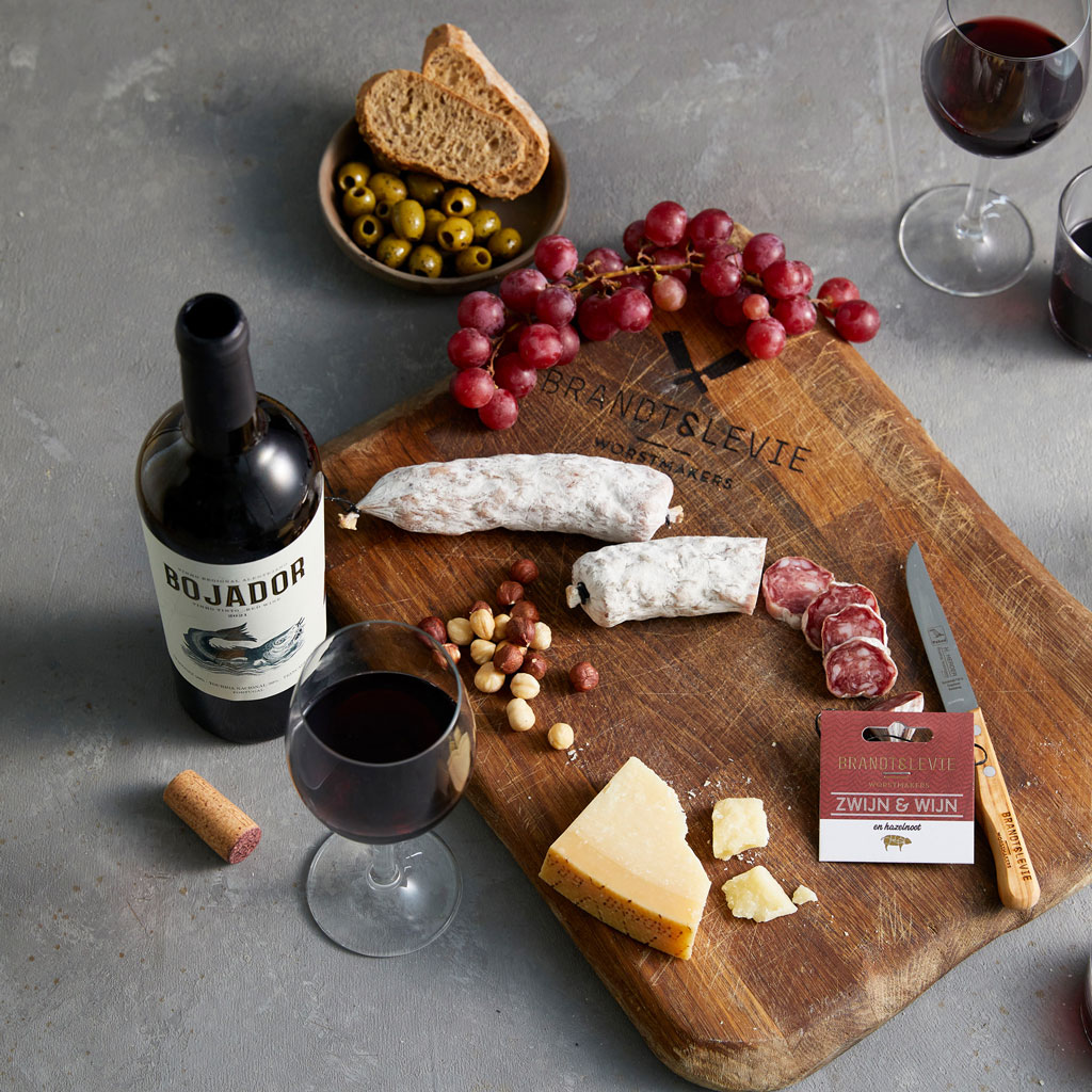 Grapedistrict vond de juiste wijnboer wiens wijn goed past in én bij de worst van Brandt & Levie. De Bojador Tinto Alentejo van Pedro matcht sterk met de smaak van wild zwijn. Zo ontstond de droge worst collab “Zwijn & Wijn”: een culinaire worst voor op een winterse borrelplank. Goed geproduceerd, vol van smaak en mooi te combineren met een goed glas rode wijn. Het idee voor de worst ontstond aan de keukentafel van Brandt & Levie, waar founder Samuel Levie zijn visie op de vleesindustrie deelde met founder Gijs Groenevelt van Grapedistrict. Ze merkten op hoeveel raakvlakken er tussen beide bedrijven zijn. Het logische raakvlak: het borrelmoment, maar vooral ook het gedachtegoed om minder, maar beter te eten of drinken. Liever beter vlees en een goede fles dan kwantiteit en massaproductie.