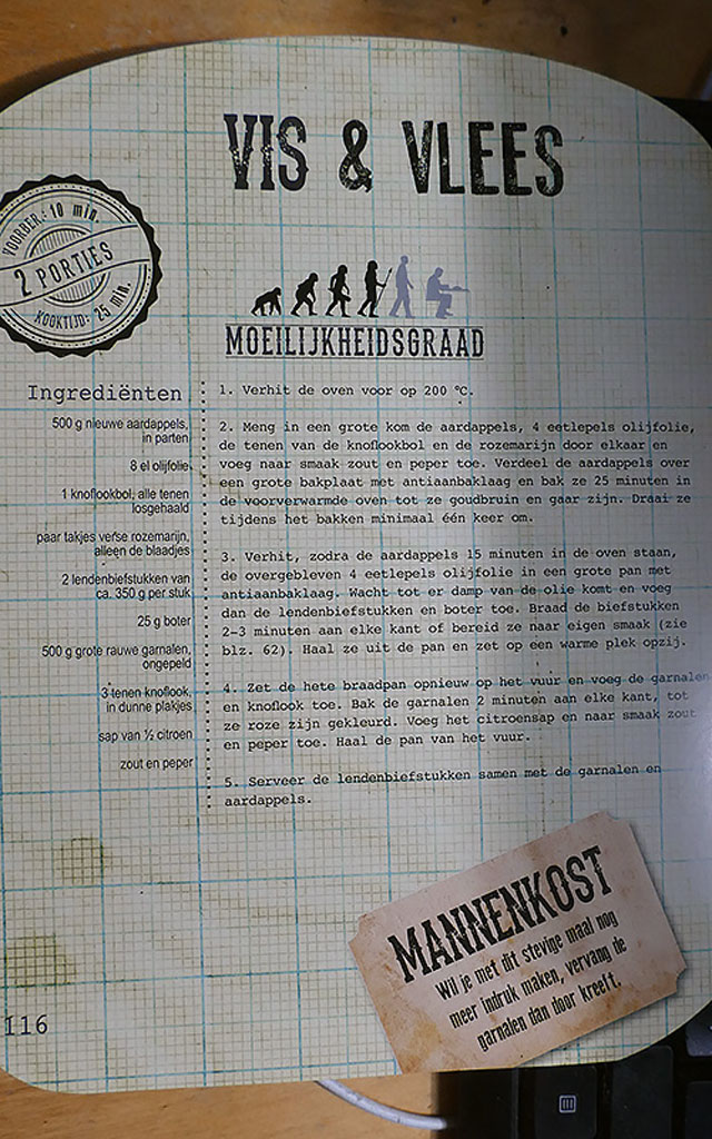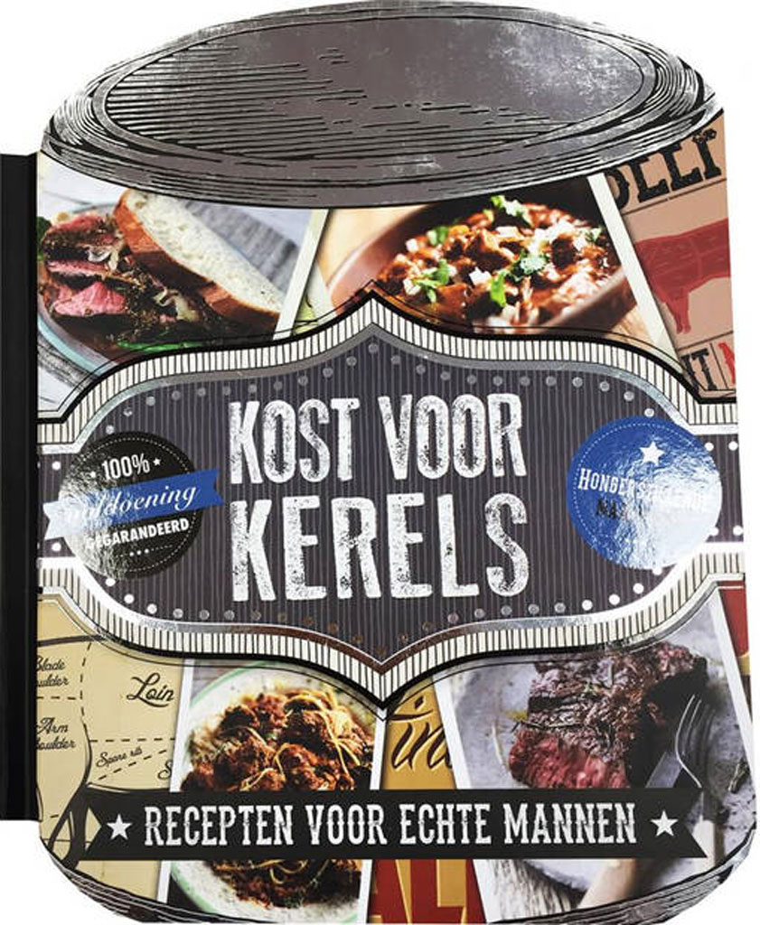 Het kookboek ‘Kost voor kerels’ is inderdaad heel hilarisch. Uitstekende recepten, maar bewust met veel vlees en andere ‘ongezonde’ ingrediënten, het is een boek voor mannen tenslotte! Vandaar de titel. Zo staat er bij één van de recepten bij het vlees: ‘een kilo, maar meer mag natuurlijk ook’. Het is een recept voor twee personen. Een pond vlees per persoon, kom daar vandaag de dag nog om! Ik plaats één recept hierbij, om een indruk te geven.