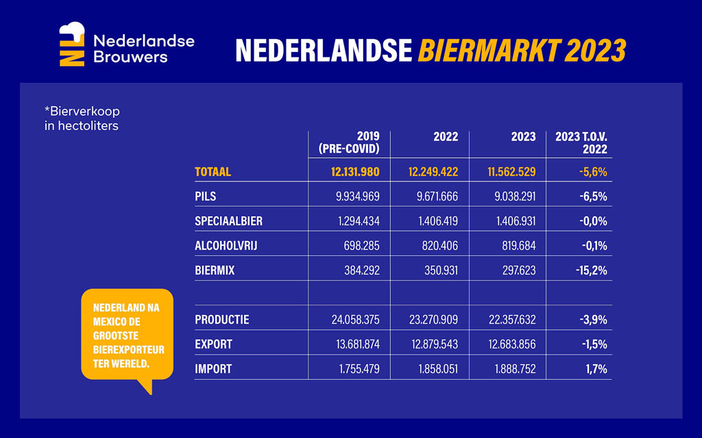 In 2023 is zowel de horeca- als de thuisconsumptie van bier gedaald. De verkopen van pils en biermixen (zoals Radlers) daalden respectievelijk met 6,5 en 15,2 procent. Waar de afgelopen jaren vooral de consumptie van speciaalbier en alcoholvrij bier groeide, bleef de verkoop dit jaar stabiel. Ook had de inflatie een negatieve impact op de verkoop. Daarnaast speelde ook het slechte zomerweer de biermarkt parten. Vooral biermixen zoals Radler, die vooral worden gedronken bij mooi weer, hadden daar veel last van.