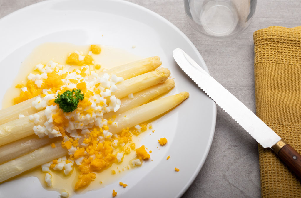Je kan met asperges alle kanten uit, zoals blijkt uit het dikke kookboek ‘Het asperge boek’. Maar wat ik ooit heb geprobeerd met witte asperges, ik kom altijd terug bij de klassieke ‘Asperges à la Flamande’. Met groene experimenteer ik des te meer, maar bij de witte asperges is de meeste eenvoudige bereidingswijze toch de lekkerste. Hoe eenvoudiger, hoe beter. Dat geldt voor alle, zeker op het oog bewerkelijke recepten. Asperges à la Flamande zijn asperges met gesmolten boter en fijngehakt hardgekookt ei. En niet te vergeten, essentieel voor de subtiele smaak: nootmuskaat. Een kennis van me in Leiden, Henk van der Zee, was eigenaar en chef-kok van het gerenommeerde Leidse restaurant ‘Fabers’. Maar uiteraard zoals mijn leeftijdsgenoten reeds enige tijd met pensioen. De restaurantrecensie schrijver van de Volkskrant ging er eens asperges eten. De kop boven de recensie luidde, vet gedrukt: “met noot!” Nootmuskaat was in de jaren ’70 en ’80 van de vorige eeuw uit de mode, te gewoontjes. Maar is noodzakelijk bij groenten als bloemkool, boontjes, spruitjes en uiteraard asperges. Nootmuskaat moet je in kleine hoeveelheden gebruiken en altijd vers gerapt. De smaak van de noot gaat anders snel achteruit. Bovendien kan je met vers raspen ook makkelijker doseren. Een overdosis nootmuskaat is namelijk giftig. En niet dodelijk zoals je overal en nergens leest. Ik geloof dat in Nederland de afgelopen decennia er één jong kind aan overleden is. Maar je kan er wel goed beroerd van worden en dat is natuurlijk zonde van je maaltijd.  Dus: altijd met mate!