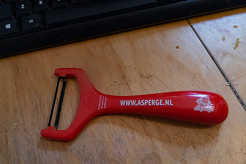 Ook een punt van discussie is de kooktijd. Je moet ze goed dun schillen, de buitenste schil van een asperge is draderig. Er zijn speciale asperge dunschillers. Ik heb er eentje, maar ik kon nu hier in het westen nog geen vers gestoken asperges krijgen en zodoende kan ik geen foto’s maken van het gebruik ervan. Ik kan de dunschiller (foto) van harte aanbevelen. Dus voor de experimenten nu toch maar asperges uit een potje gebruikt. Geeft niet, die zijn ook lekker, maar halen het niet bij verse!. Ik had geen zin om groene te gebruiken, die zijn het hele jaar verkrijgbaar, groene gebruik ik vaak voor aspergesoep. Groene hoeft je bijna niet te schillen, alleen het harde kontje er af snijden. Het Brabants Asperge Genootschap (BAG) geeft voor goed geschilde witte asperges een kooktijd aan van 5 tot 10 minuten aan (afhankelijk van de dikte), met 5 minuten nagaren.