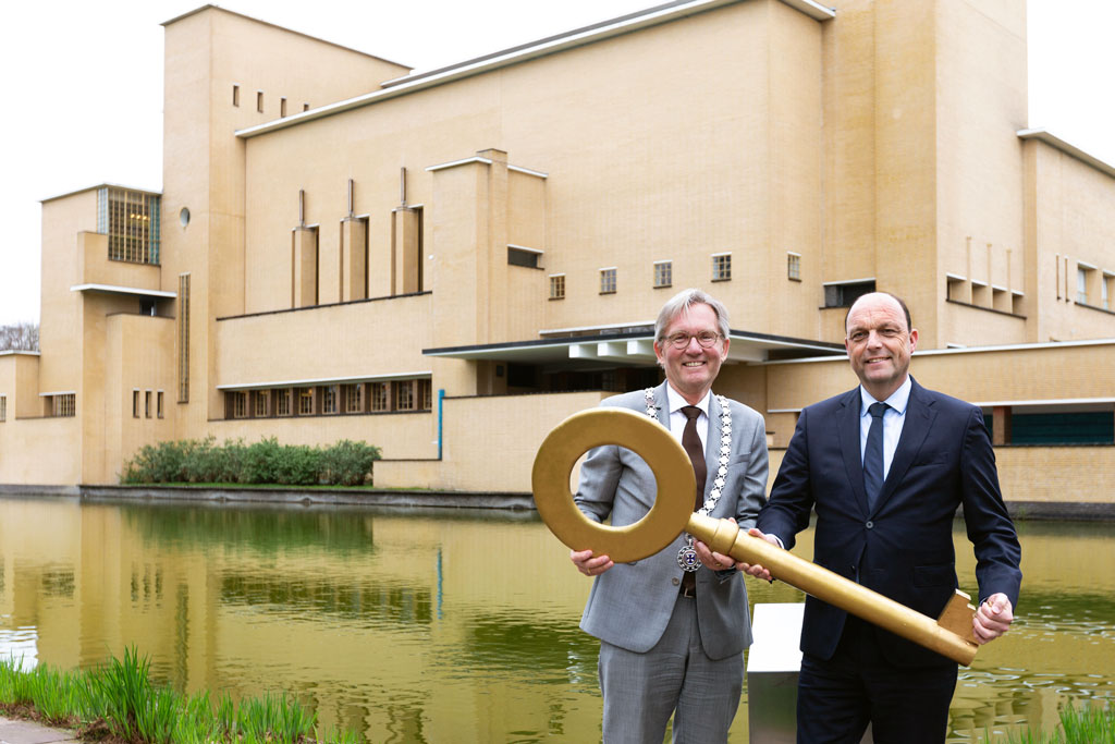 Burgemeester Snijders (Zwolle) overhandigt de Open Monumentendag sleutel aan burgemeester Van den Top (Hilversum).