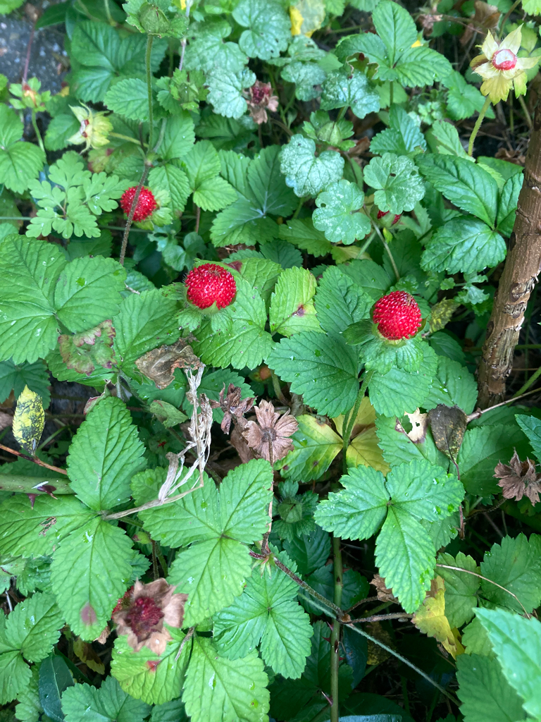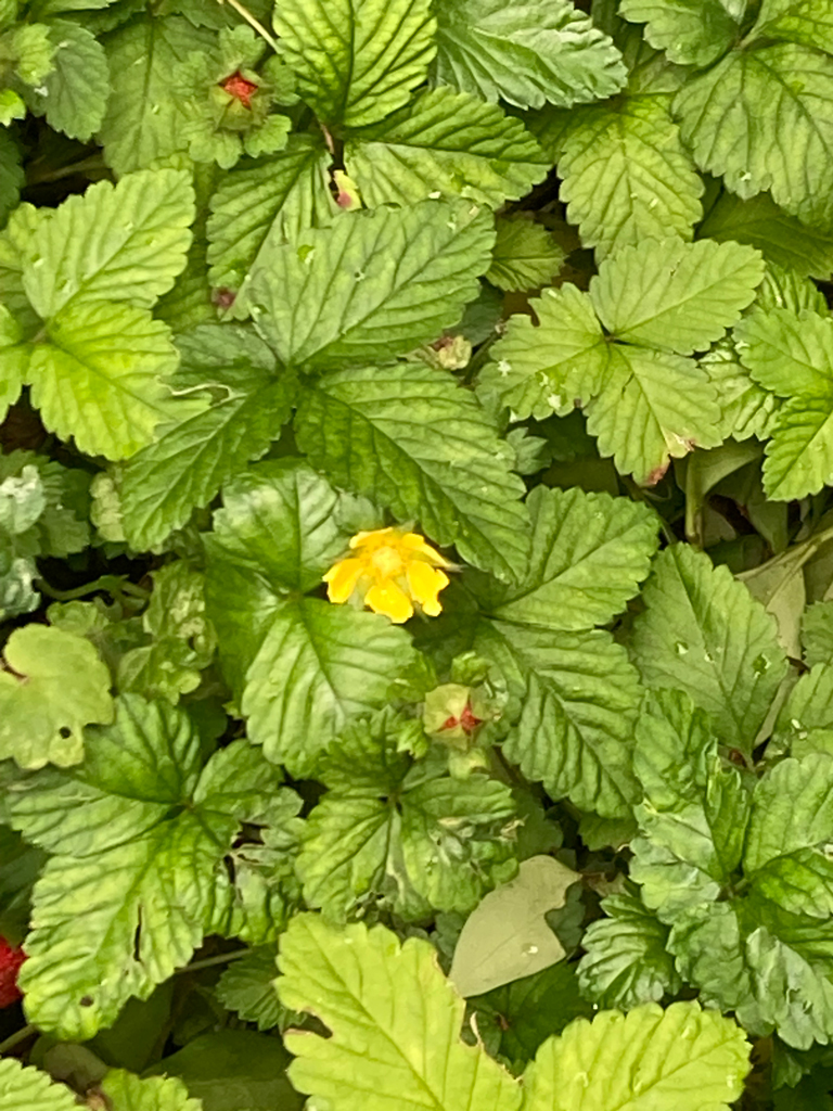 Een andere invasieve exoot, die er heel onschuldig uitziet, maar het niet is, is het hele mooie schijnaardbeitje of Indisch aardbeitje. Fragaria (Duchesnea) indica. Zowel de Nederlandse als de wetenschappelijke naam geven aan dat deze uit Zuidoost Azië is ingevoerd. In dit geval als tuinplant. Hij is heel eenvoudig te herkennen. Hij lijkt heel sterk op een bosaardbei, maar dan met gele bloemen. De vruchten zien er oppervlakkig bekeken exact zo uit als aardbeitjes, de verschillen zijn pas zichtbaar (en voelbaar!) bij nadere beschouwing. De vruchten zien er heel appetijtelijk uit en zijn inderdaad eetbaar, maar helaas volledig smakeloos. Het is een bodembedekker in een halfschaduwrijke tot schaduwrijke tuin, waar ze de hele bodem kunnen overwoekeren. Daarbij verdringen ze alle andere planten zoals de inheemse bosaardbei. Kijk je naar het verspreidingskaartje in de atlas van Floron, dan blijkt dat ze in ieder uurhok waargenomen zijn. Dat wil zeggen dat ze niet alleen in landelijk gebied, maar ook veel in steden. Daar groeien ze tussen de straatstenen en langs stoepranden, in plantsoenen et cetera.