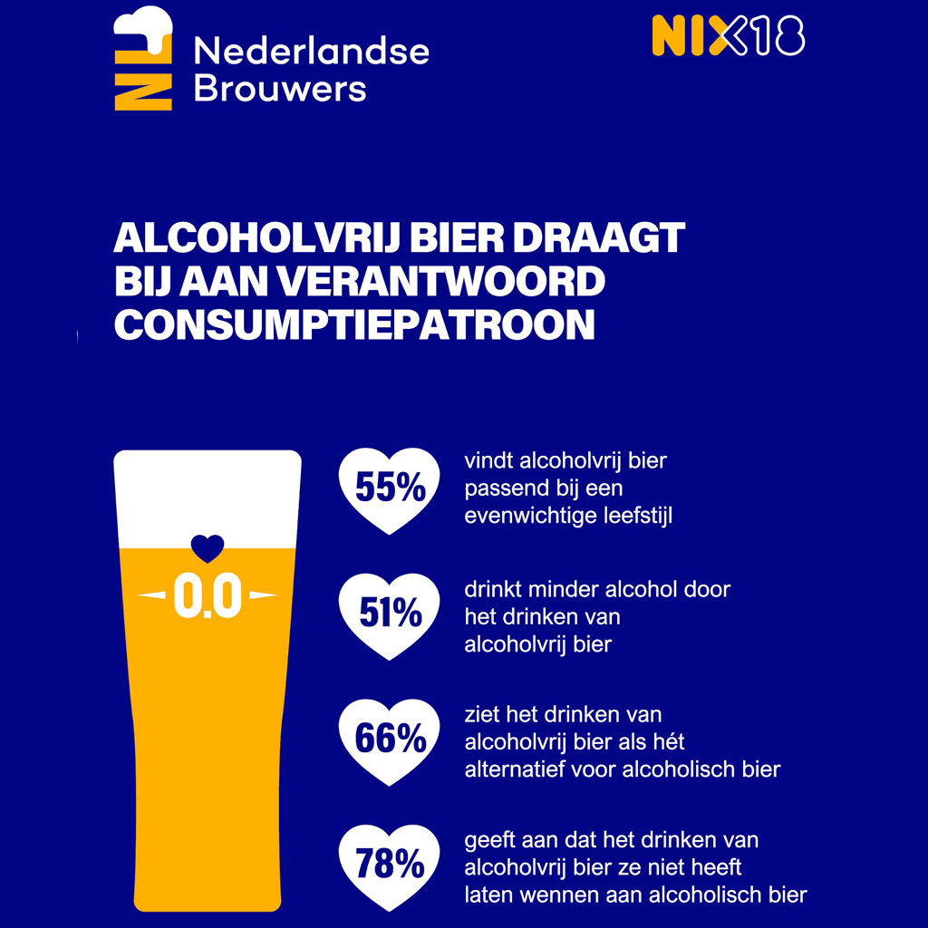 Uit onderzoek in opdracht van Nederlandse Brouwers blijkt dat de meerderheid van de ondervraagden vindt dat alcoholvrij bier past in een evenwichtige levensstijl. Ongeveer de helft van de 18-plussers geeft aan minder alcohol te drinken vanwege alcoholvrij bier. Het onderzoek neemt de misvatting weg dat drinken van alcoholvrij bier de opmaat is van drinken van bier met alcohol. 1 op 2 (18-39) tot 2 op 3 (40+) begon eerst alcoholisch bier te drinken voordat ze alcoholvrij bier gingen drinken. Ondervraagden in de leeftijd 18 – 39 geven aan dat alcoholvrij bier alcoholmisbruik voorkomt. Dat laatste is precies de reden waarom Nederlandse Brouwers in het kader van het Nationaal Preventieakkoord heeft afgesproken vol in te zetten op het stimuleren van alcoholvrij bier.