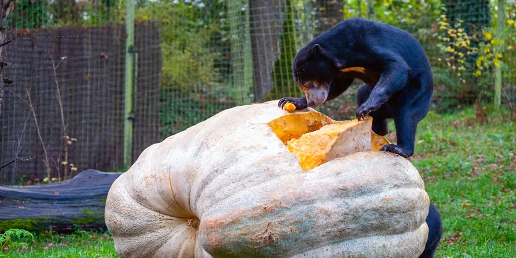 Donderdag 14 november om 08.30 uur stuiten de drie Maleise beren van Koninklijke Burgers’ Zoo op een enorm eetbaar gevaarte in hun buitenverblijf. Met hun sterke klauwen, lange nagels en behendige tong breken de alleseters Nederlands grootste witte reuzenpompoen met een gewicht van 791 kilo open om zich vervolgens tegoed te doen aan het vruchtvlees.