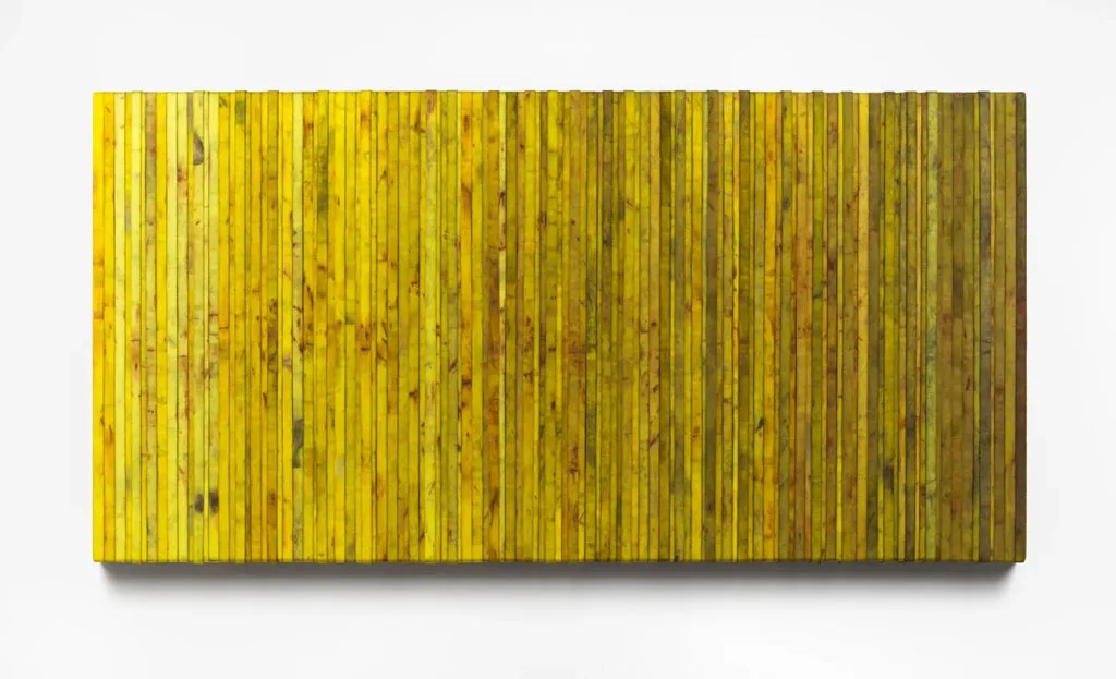 Daarnaast is de jonge kunstenaar gegrepen door de, naar eigen zeggen, indringende en bekoorlijke kleuren van het Kazachstaanse landschap. Zijn werk geïnspireerd op dit landschap, Vain no. 2 (2024), bestaat uit een zwaar frame van zes centimeter dik, ‘behangen’ met gebruikte gele, polyester spanbanden. Op de banden zit roest, verf en vuil. Ze zijn niet langer mooi geel, maar doorleefd. Waaijer: “Juist het rauwe is de aantrekkingskracht van die banden én de link met Kazachstan. Dit werk is geïnspireerd op de zandvlaktes en steppen met gele bloemen die je overal in Kazachstan ziet”.