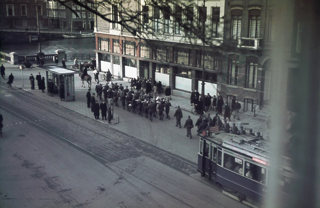 De Tweede Wereldoorlog in kleur! De herinnering aan de bezetting wordt gedomineerd door zwart-wit beelden. Maar enkele fotografen maken met behulp van diafilm al tijdens de oorlog kleurenfoto’s. De jonge Amsterdammer Frits J. Rotgans (1912-1978) is één van hen. Hij legt vast hoe de bezetting zichtbaar wordt op straat: een SS’er die op de tram wacht, reclamezuilen met Duitse propaganda, een bordje ‘Voor Joden verboden’ in het raam van een café. Ook fotografeert hij twee Joodse vrouwen, die bij hem thuis een onderduikplek krijgen, nadat ze tijdens een razzia een veilig heenkomen zochten.
