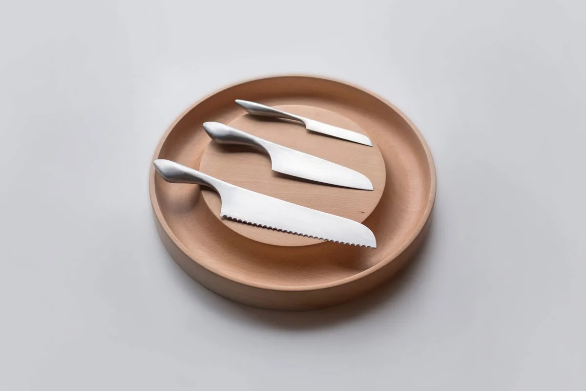 De collectie bestaat uit een snijplank en drie messen: