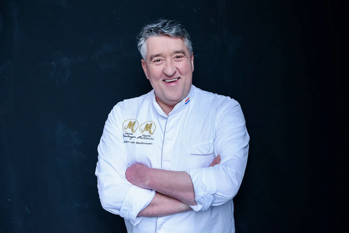 Robèrt van Beckhoven (64), bekend van televisie en eigenaar van ‘bij Robèrt’ in Oisterwijk, heeft een unieke prestatie geleverd: hij is vanaf vandaag officieel SVH Meesterijsbereider. Daarmee is hij de enige vakman in Nederland die drie Meestertitels op zijn naam heeft staan: Meester Patissier (2010), Meester Boulanger (2013) én nu dus Meesterijsbereider. Een zeldzame kroon op een al indrukwekkende carrière.