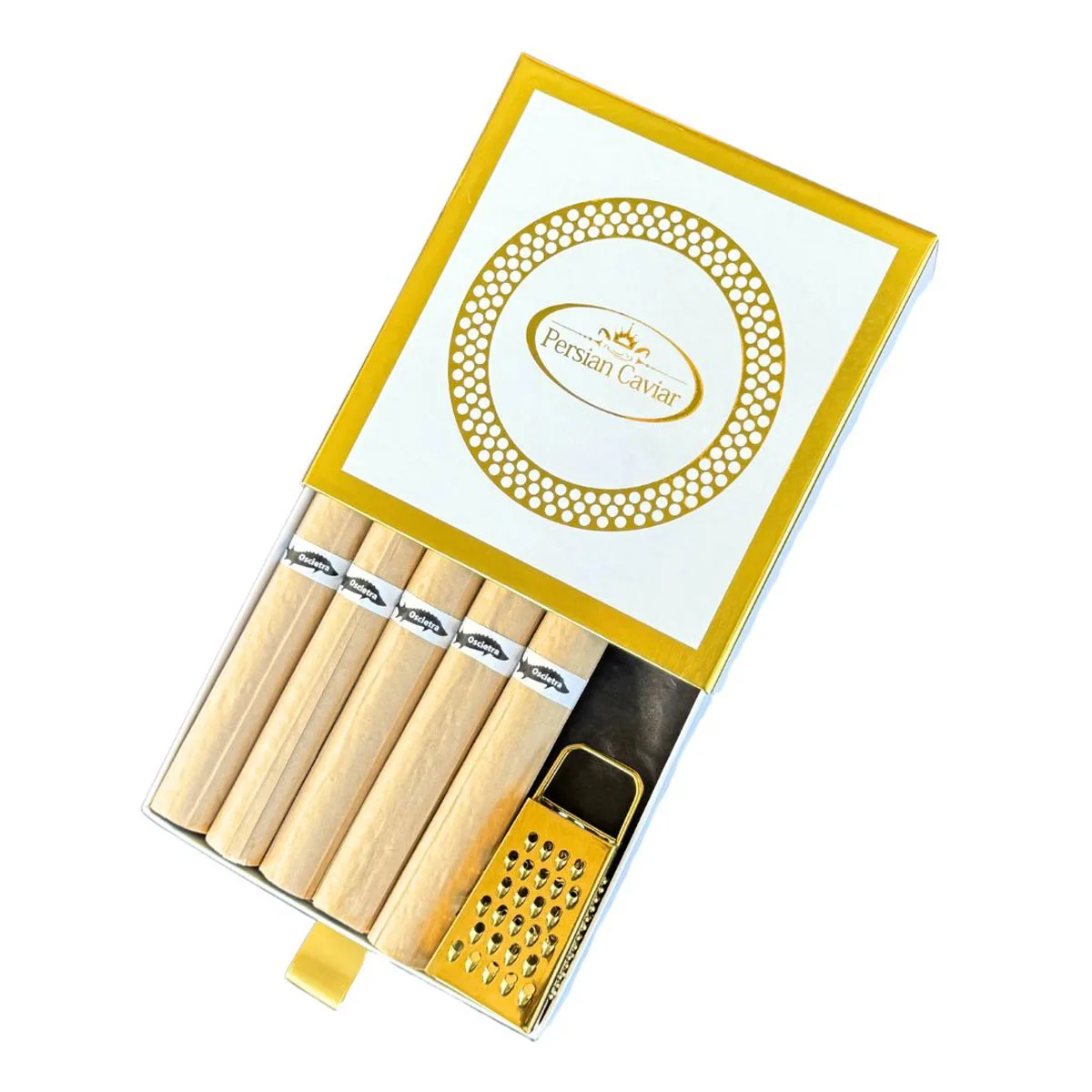 Kaviaar hoeft niet langer enkel op exclusieve menu’s te staan. Met de introductie van een nieuwe, gedroogde kaviaarvorm – inmiddels liefkozend de ‘kaviaar sigaar’ genoemd – maakt Persian Caviar het luxeproduct toegankelijk voor een bredere groep chefs. De compacte cilinder van geperste, ‘dry aged’ kaviaar wordt geleverd met een goudkleurig schaafje, geïnspireerd op het klassieke truffelschaafje. Hiermee kunnen chefs tot wel 100 gerechten afmaken met een smaakvolle ‘touch of caviar’, tegen een inkoopprijs van slechts circa 50 cent per bord.