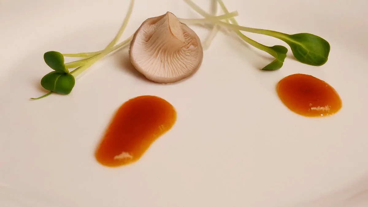 Ik keek op het bord: een stip saus, twee microblaadjes, en iets dat op een gedesintegreerd oesterzwammetje leek.