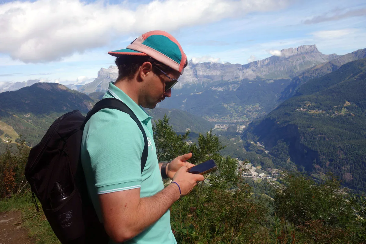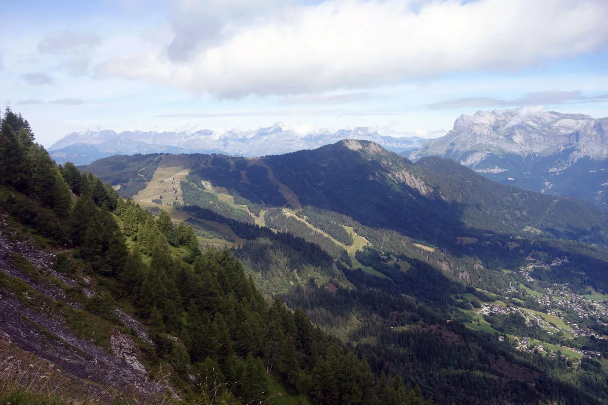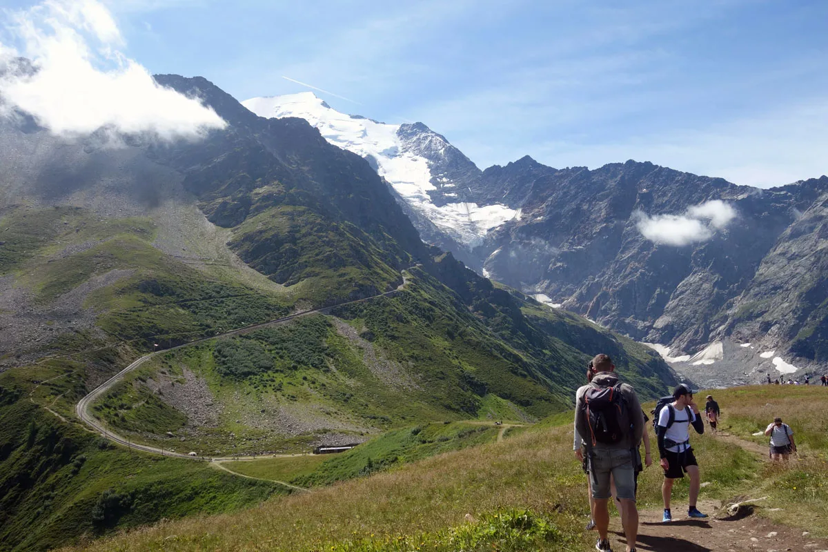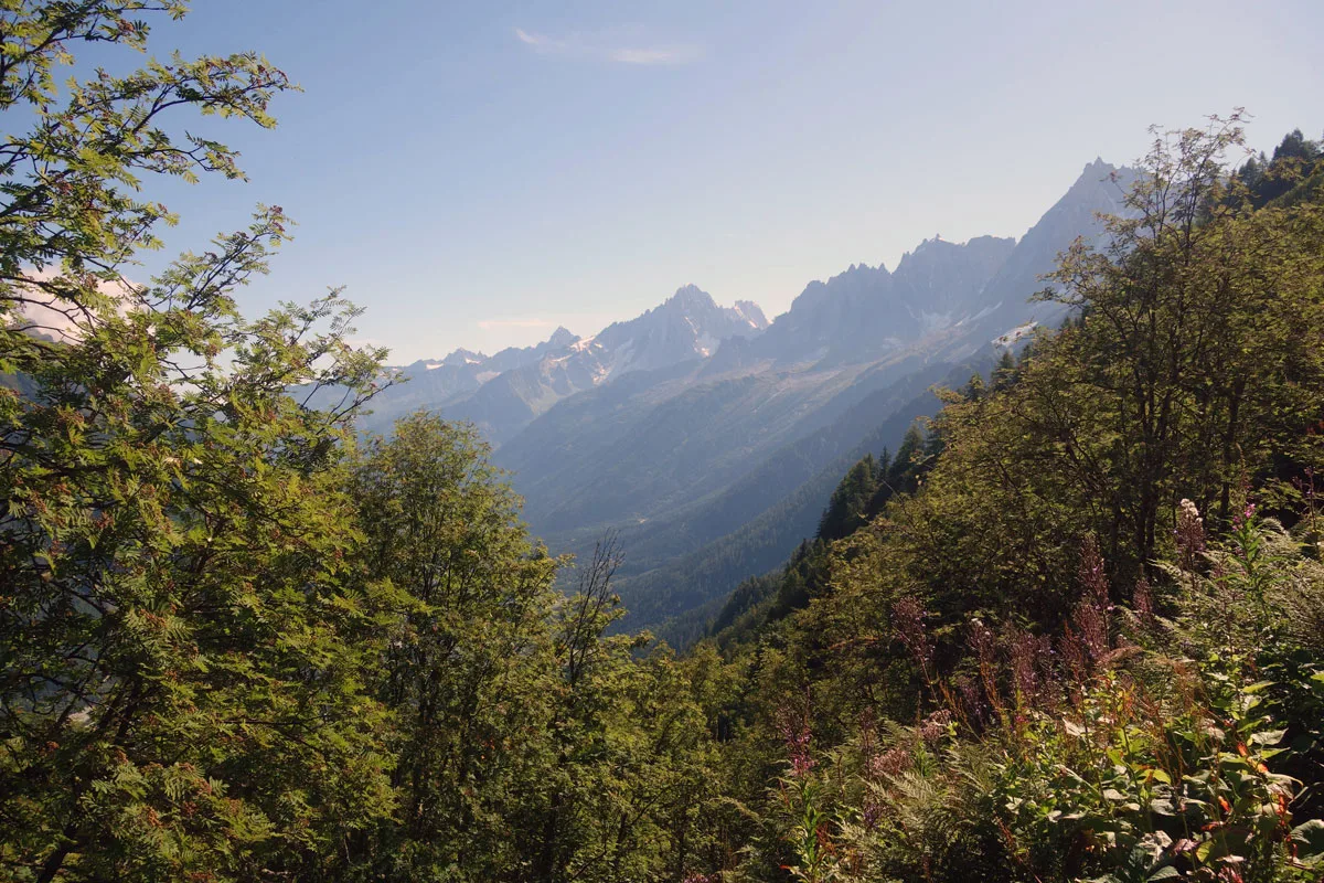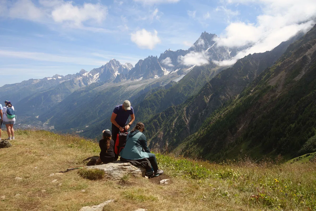 Voor ons volstaat het prachtig zicht op de Mont Blanc en een stevige bergwandeling. We hadden op voorhand een kant-en-klare picnick (€18) via de website van de Tramway besteld die klaar ligt op het afhaalpunt in het station Saint-Gervais. Daar hebben we ook afgesproken met onze gids Valentin en samen vertrekken we met de Tramway du Mont Blanc naar Bellevue voor een randonnée tot aan Mont Lachat. Onderweg genieten we van de panoramische uitzichten op de vallei van Chamonix, de omliggende bergen en alpenweiden met bloemen. Een kleine passage kan mensen met erge hoogtevrees afschrikken omdat je naast een diepe afgrond loopt. Maar het pad is ongeveer een meter breed en goed onderhouden. Af en toe horen we het scherp fluitend geluid van marmotten, alhoewel ze zich niet rap laten zien.