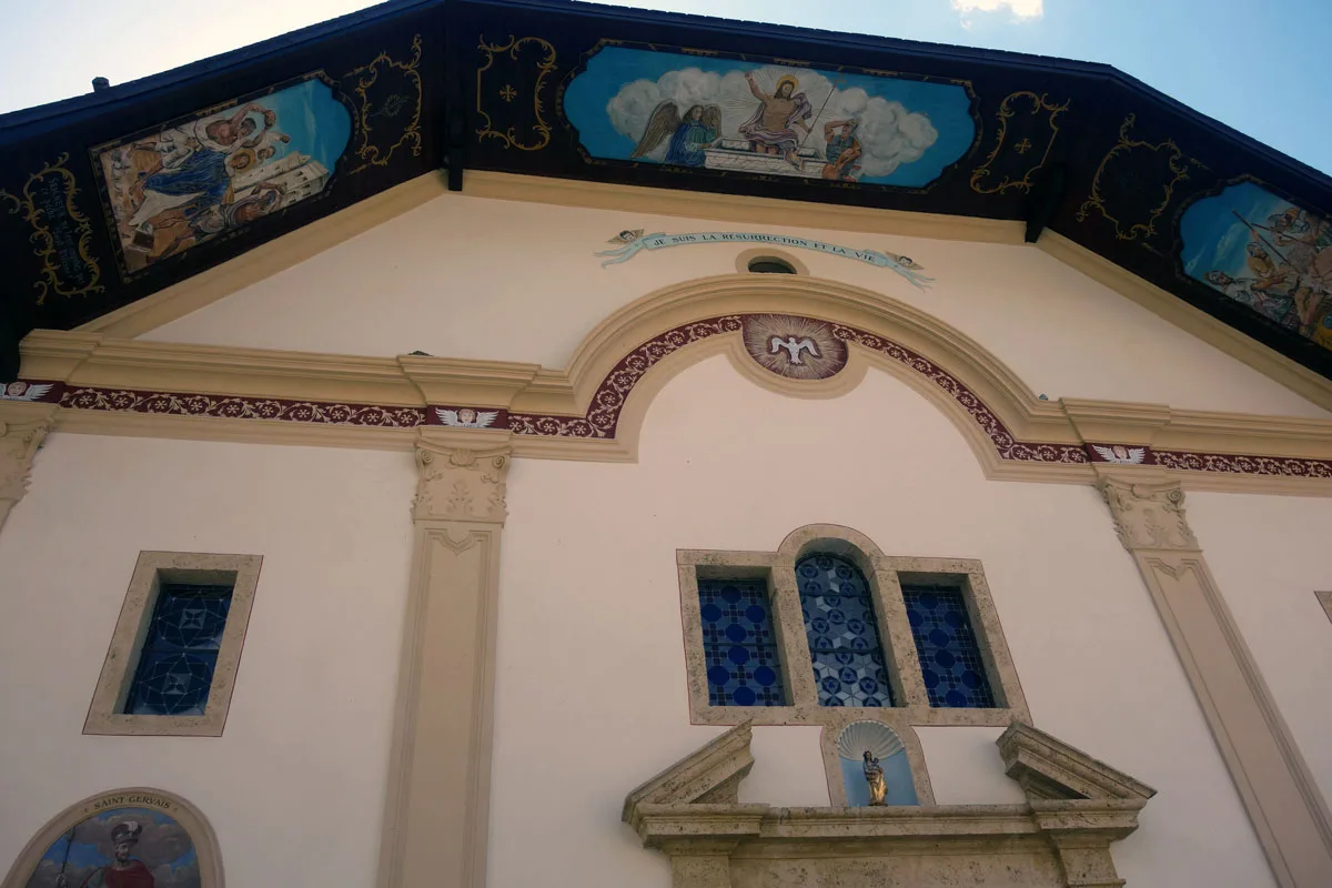 Het eerste wat opvalt tijdens een lunch op het terras van brasserie du Mont Blanc is dat Saint-Gervais geen ski-dorp is op maat van de toeristen, maar een authentiek bergdorp waar toeristen, zowel ouderen als gezinnen met kinderen, als gasten welkom zijn. Een grote troef is dat je je wagen gratis kunt parkeren aan de rand van het dorp omdat alles in de omgeving bereikbaar is met bergtreintjes of kabelbanen. Het barokkerkje met kleurrijke schilderingen op de binnenzijde van het overhellend dak wekt onze nieuwsgierigheid. Wanneer onze gids Olivia ons komt ophalen, vertelt ze er meer over.