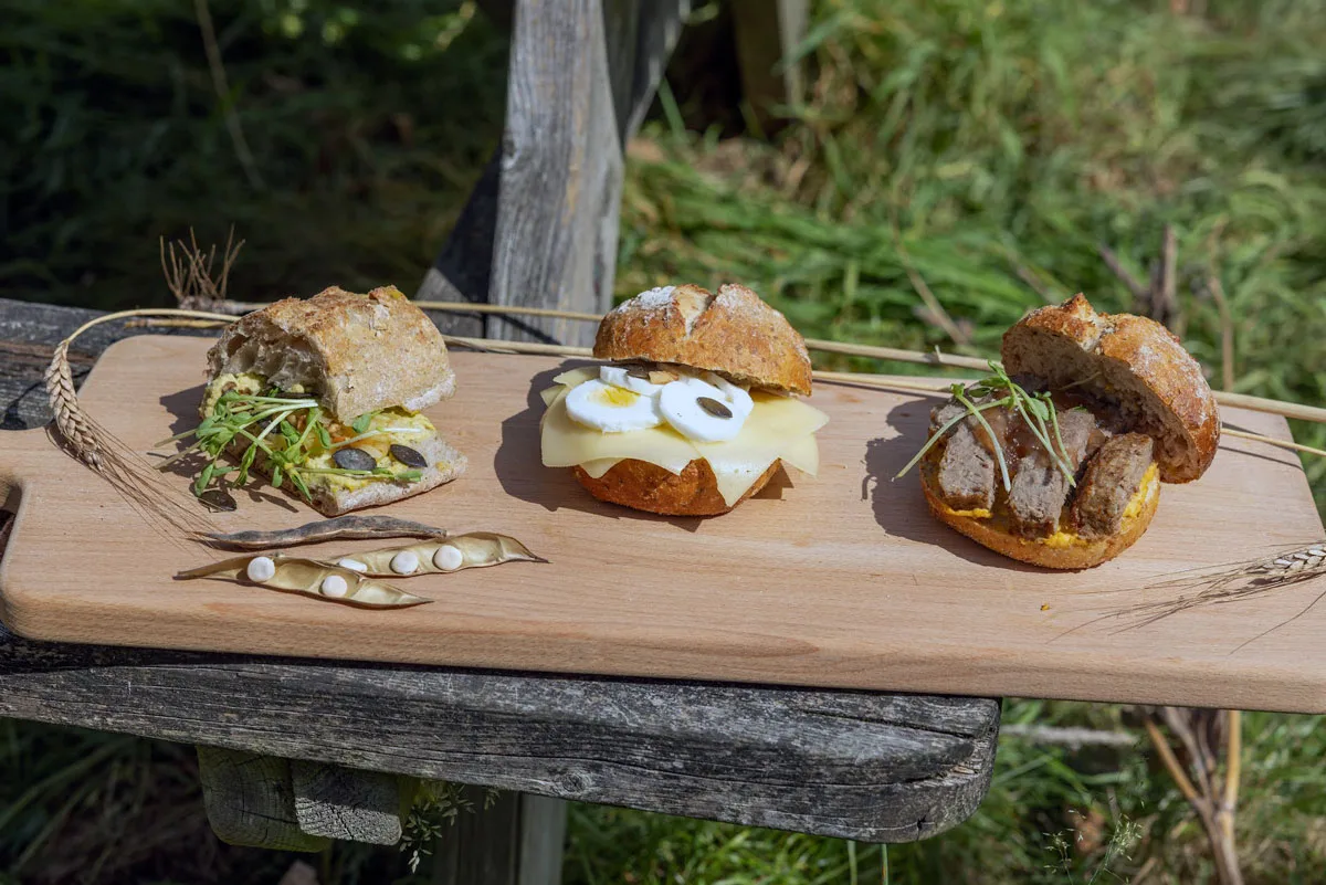 De Broodje Gelderse Vallei komt in drie varianten: met lupine, kaas of een gehaktbal. Alle ingrediënten komen van boeren uit de regio die werken met oog voor natuur en biodiversiteit.