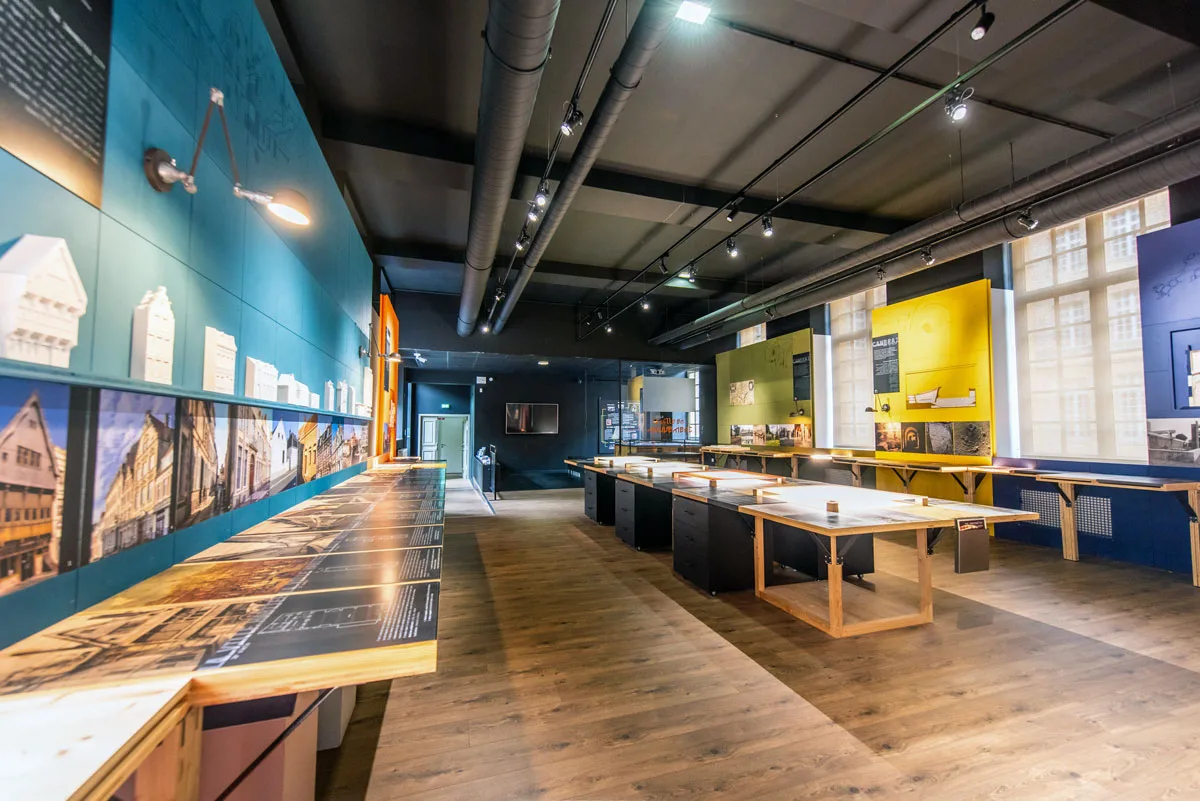 Op aanraden van de toeristische dienst starten we onze ontdekkingstocht in Cambrai met een bezoek aan CambraiScope gevestigd in een oude jezuïetencollege uit de 17e eeuw. Naast het cultureel centrum Le Labo is er ook een bibliotheek en allerlei voorzieningen voor de Kamerijken (Kamerijk is de Nederlandse naam voor de Franse stad Cambrai). CambraiScope is een audiovisuele beleving, die de geschiedenis van Cambrai op een toegankelijke manier vertelt. Met behulp van projecties, maquettes en audiovisuele effecten wordt duidelijk hoe de stad zich door de eeuwen heen ontwikkelde: van een Romeinse stad, middeleeuwse bisschopszetel, belangrijke industriestad tot de moderne stad die ze vandaag is. Het is een meeslepende reis door de tijd en de ideale manier om de context te begrijpen van de vele monumenten en plekken die we vervolgens tijdens een rondleiding met de gids zullen zien.