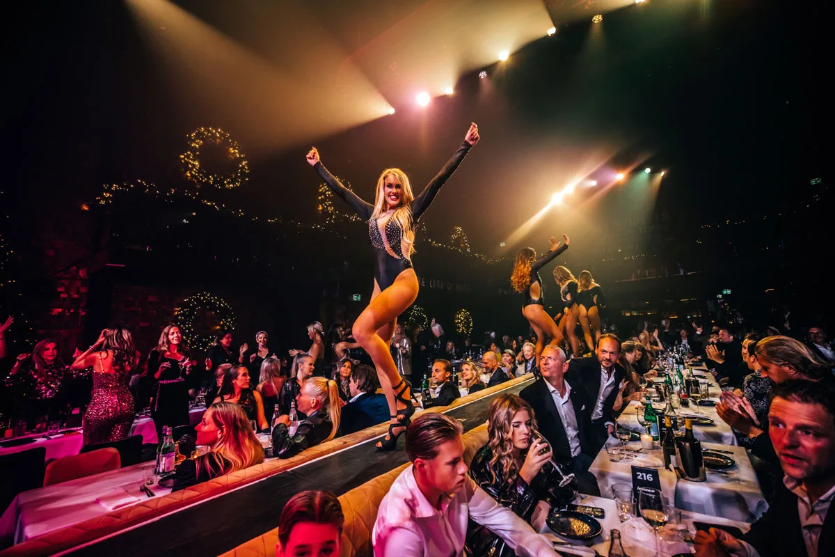 Tussen de tafels duiken zangers, acrobaten en dansers op – soms uit het niets, soms van de kleine podia verspreid door de zaal. Denk aan fine dining meets flashmob, met champagne in plaats van popcorn.