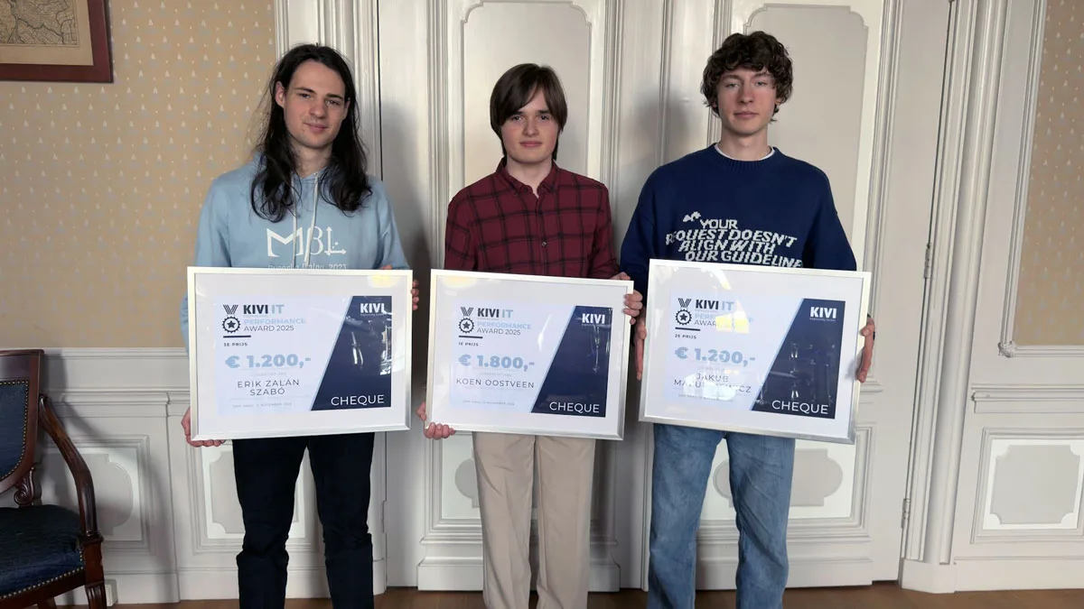 KIVI selecteert de winnaars op basis van officieel vastgelegde tentamenresultaten uit het eerste studiejaar. Voorzitter Robert ten Hoor overhandigde de prijzen en gaf de jonge talenten een stevige duw richting hun verdere carrière. Koen Oostveen, student Technische Wiskunde aan de Universiteit Twente, kaapte de hoofdprijs weg. Hij strijkt komend academisch jaar €150 per maand op én krijgt gratis KIVI-lidmaatschap erbovenop – een combinatie waar zelfs de beste differentiaalvergelijking niet tegenop kan.