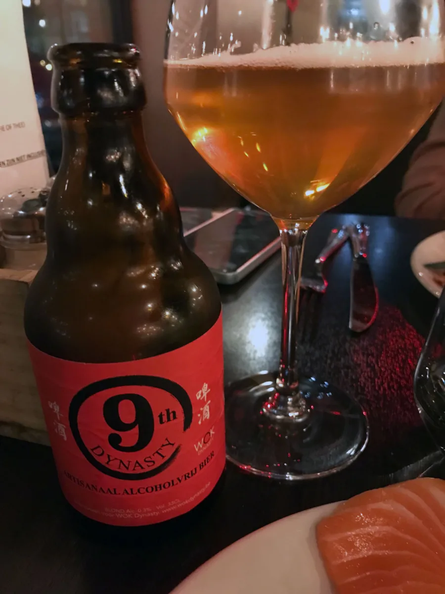 We starten met een klassieke cava en een lycheewijntje. Water wordt aangeboden. De avond zal ik verder genieten van het nieuwe alcoholvrije ‘9th Dynastie’-bier, ontwikkeld in samenspraak met brouwerij Craywinckelhof te Lubbeek. (Er bestaat ook een blonde tripelversie van). Artisanaal en karaktervol, met een mooi smaakprofiel. Mijn partner blijft bij water. Het cijfer 9 verwijst naar het geluksgetal in China.