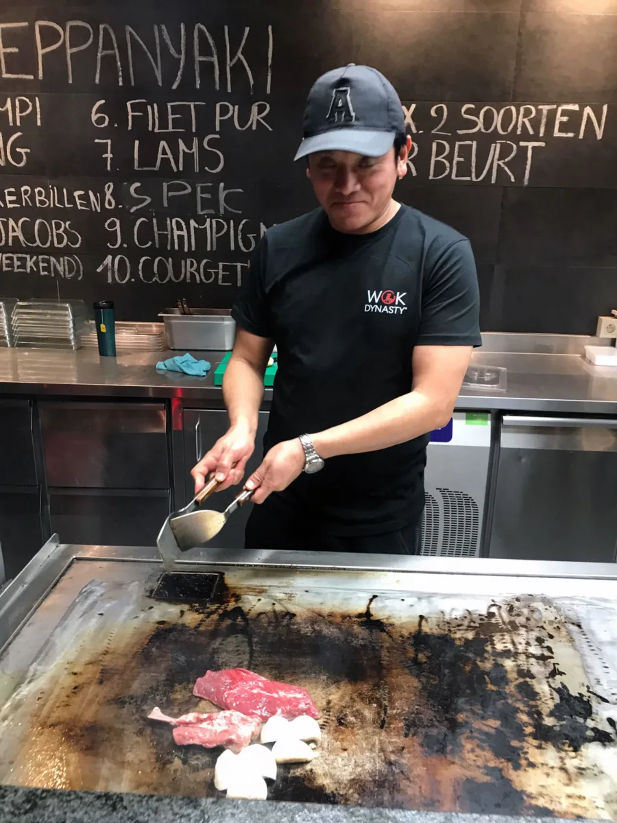 We gaan voor de sushi, sushimi en keren nadien nog terug voor de lekkere dimsun, de oesters en de halve rivierkreeft, om af te sluiten met bami, gelakte eend. Als hoofdgrecht kies ik steak, mijn partner heeft zin in lams. Tijdens ‘live-coocking’ op de teppanyakiplaat, geven we de groentjes al voor de wok. Ik neem de zwarte peper-, zij gaat voor oestersaus. Smaakmakers die je wok naar een hoger niveau tillen. Niet teveel ingrediënten: sojacheuten, diverse soorten champignons, chinese groentjes, dansen in de indrukwekkende vlammen.