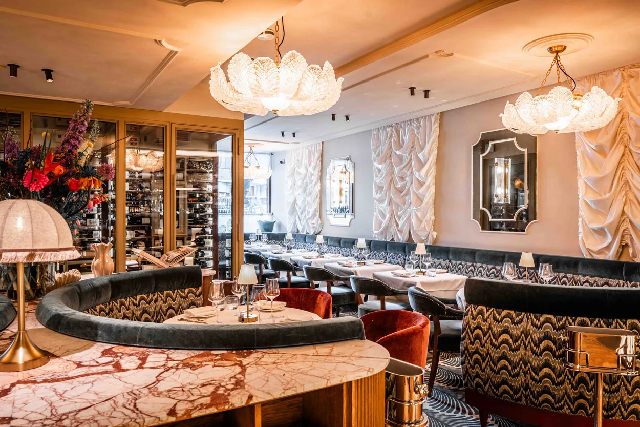Het interieur ademt Franse elegantie, maar blijft ver weg van cliché. Ontwerpbureau Horeca Sfeermakers kiest voor zachte groentinten, marmer en goudaccenten, luxe, maar niet schreeuwerig.
