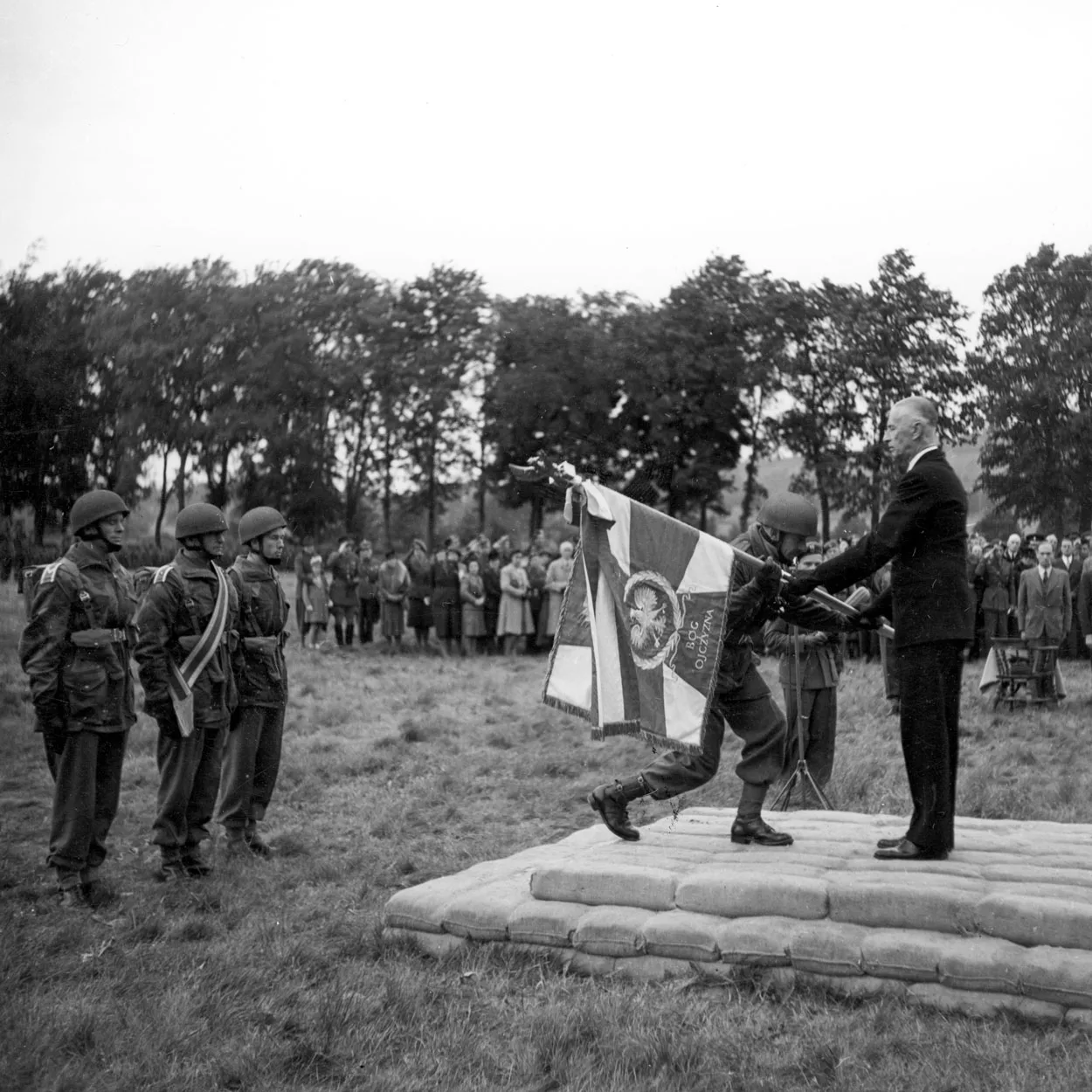 Daarna volgt een bijna filmisch traject: het vaandel wordt door bezet Europa gesmokkeld naar het Verenigd Koninkrijk, waar de Poolse president in ballingschap het in juni 1944 officieel aan de brigade overhandigt.