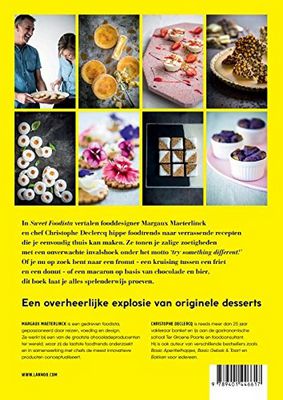 Uitgeverstekst: In Sweet Foodista vertalen fooddesigner Margaux Maeterlinck en chef Christophe Declercq hippe foodtrends naar verrassende recepten die je eenvoudig thuis kan maken. Ze tonen je zalige zoetigheden met een onverwachte invalshoek onder het motto 'try something different!' Of je nu op zoek bent naar een fronut - een kruising tussen een friet en een donut - of een macaron op basis van chocolade en bier, dit boek laat je alles spelenderwijs proeven. Een overheerlijke explosie van originele desserts